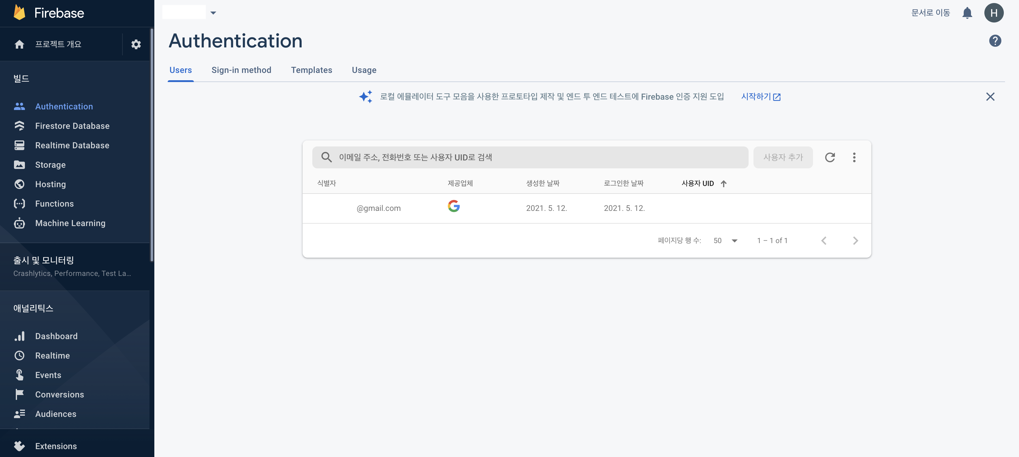 Firebase Console > Authentication > Users 탭에서 Firebase에 인증된 유저 정보를 확인할 수 있습니다.