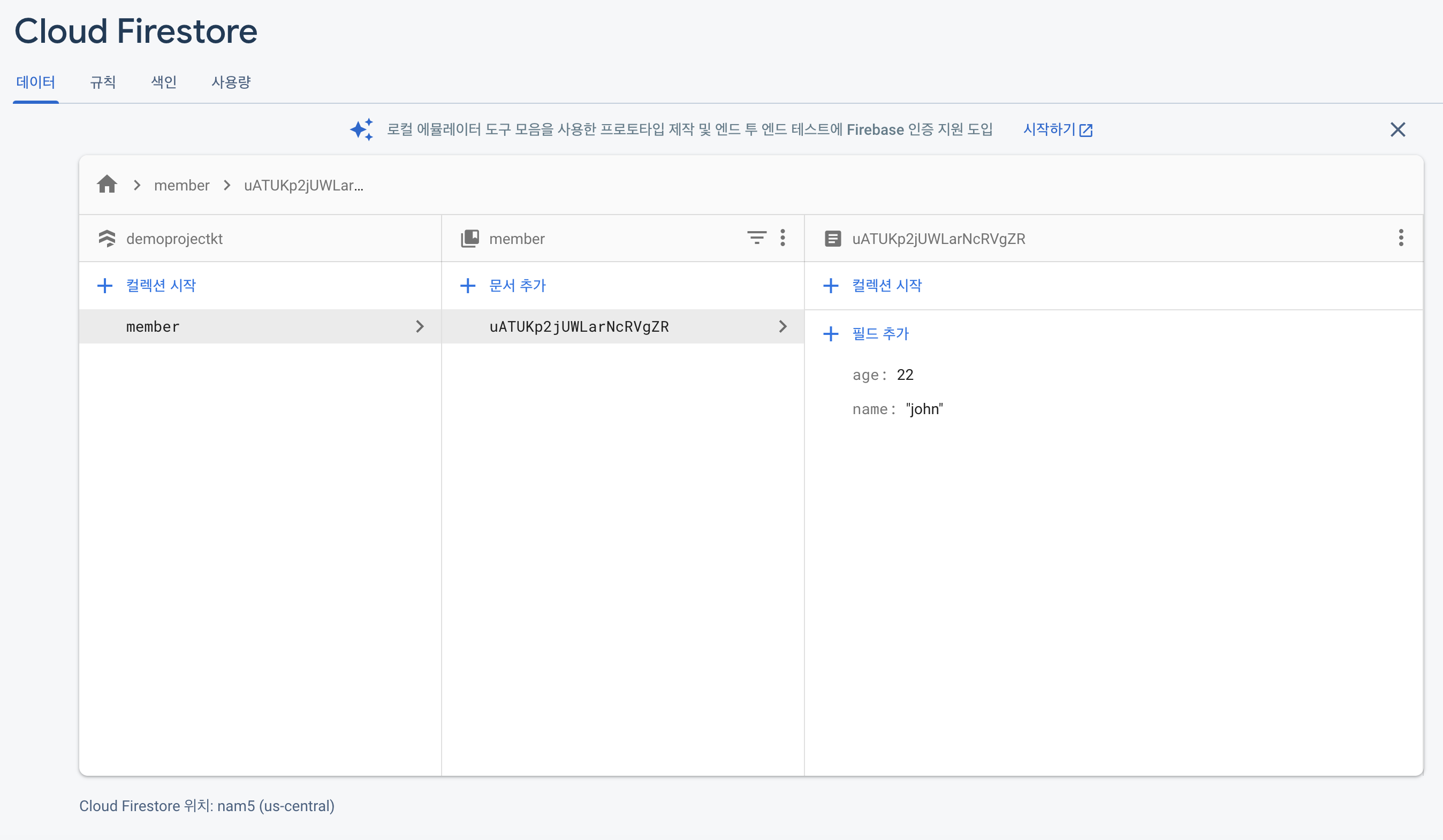 * 저장한 값에 맞춰 collection, document, field가 저장된 것을 확인할 수 있습니다.