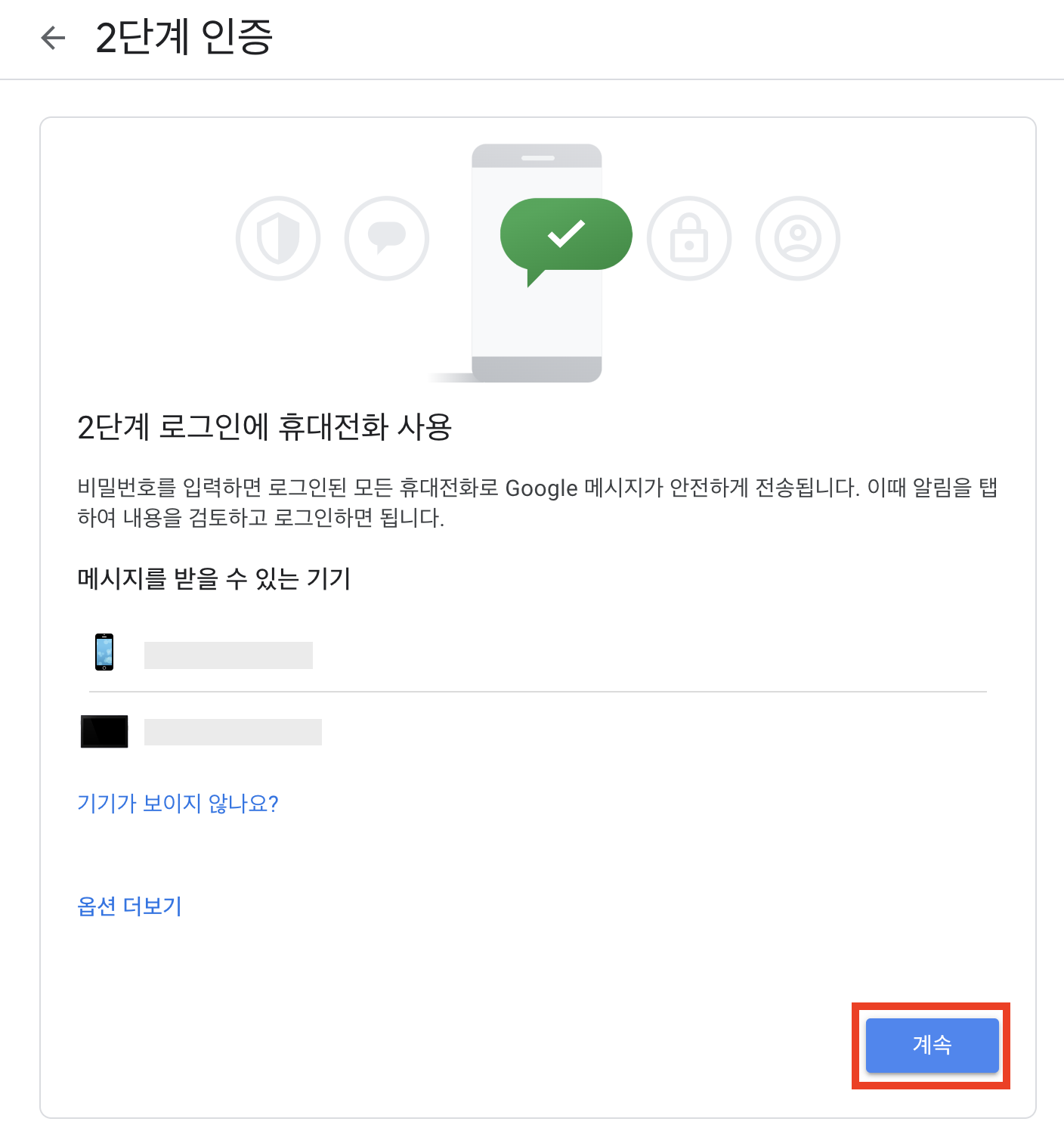 4. 로그인 시 Google 메시지를 수신 받을 기기를 확인한 후 "계속"을 클릭합니다.