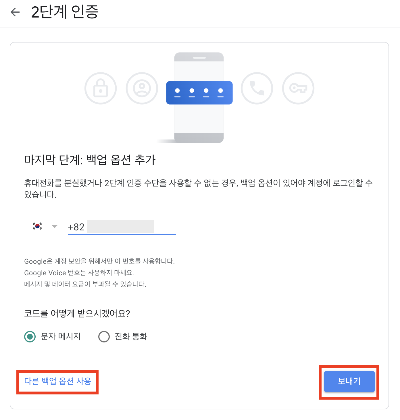 6. 백업 전화번호로 수신받은 문자 메세지의 인증번호를 입력합니다.