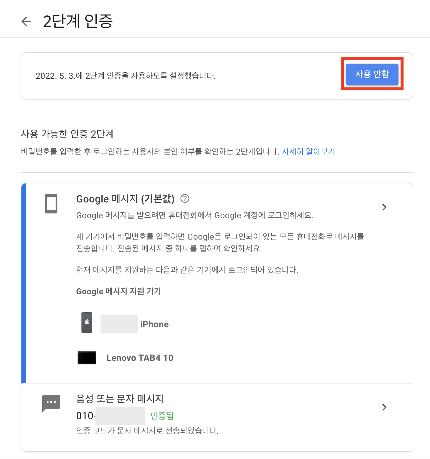 4. 2단계 인증이 "사용 안함"으로 표시되며 정상적으로 사용 중지 처리 되었음을 확인합니다.
