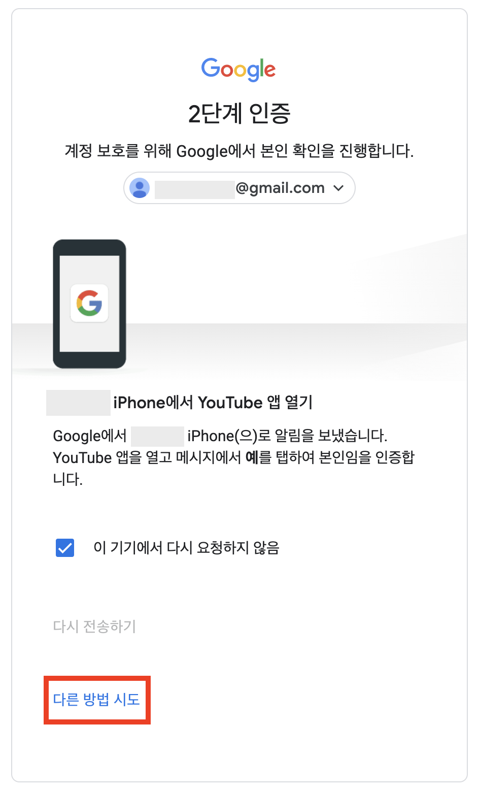다른 인증 방법을 원할 경우, "다른 방법 시도"를 클릭하여 원하는 인증 방법을 선택하여 진행합니다.