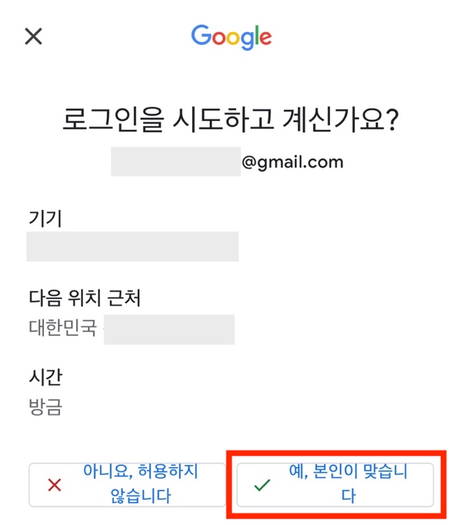 2. 2단계 인증 안내에 따라 앱을 열면 구글 본인확인 팝업이 표시됩니다.