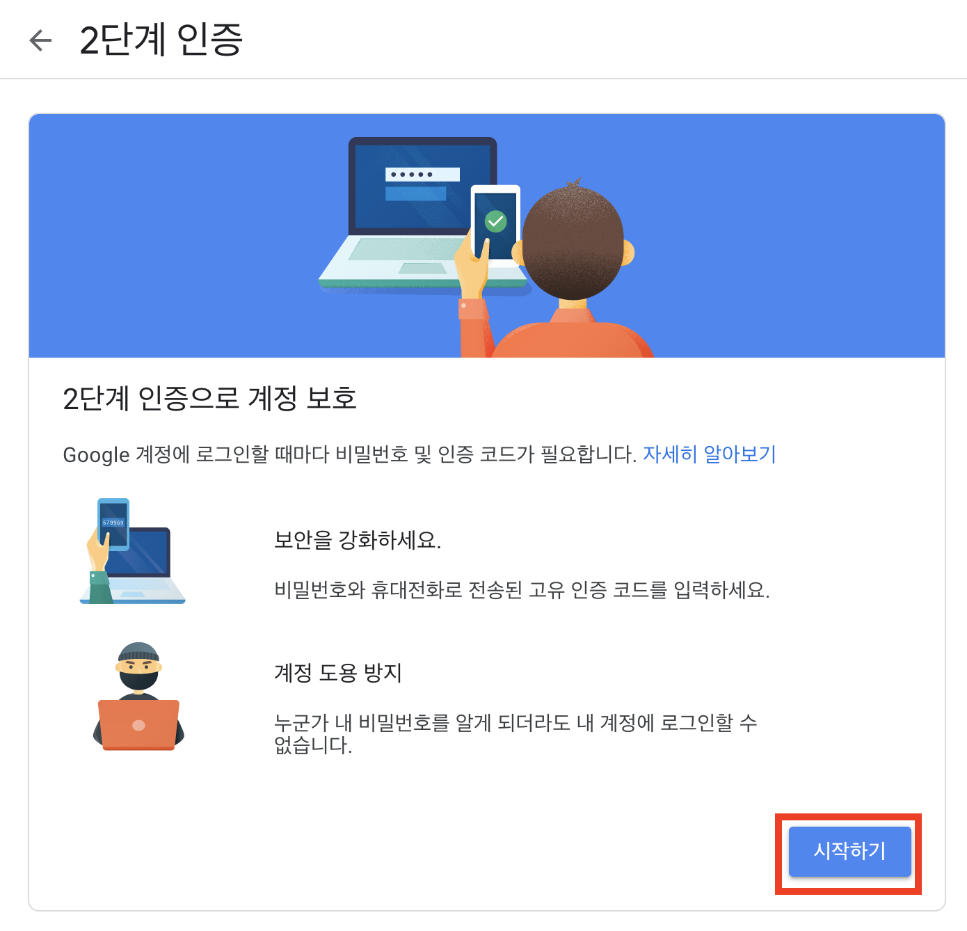 3. "시작하기"를 클릭하여 2단계 인증을 등록합니다.