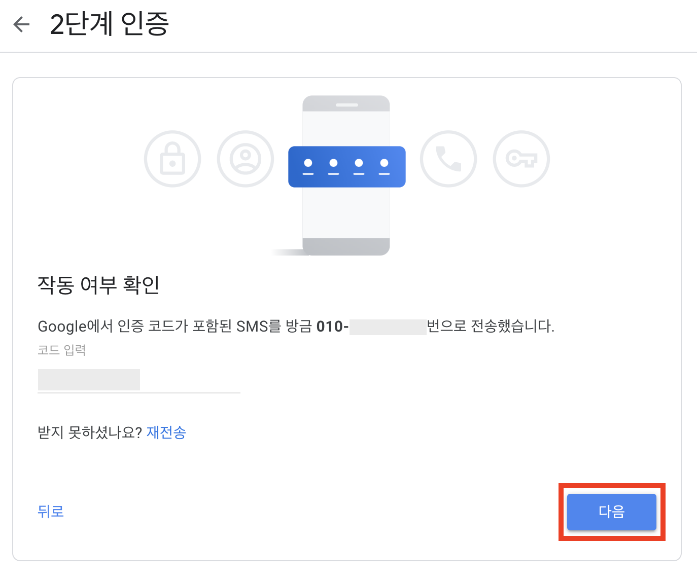 6. 백업 전화번호로 수신받은 문자 메세지의 인증번호를 입력합니다.