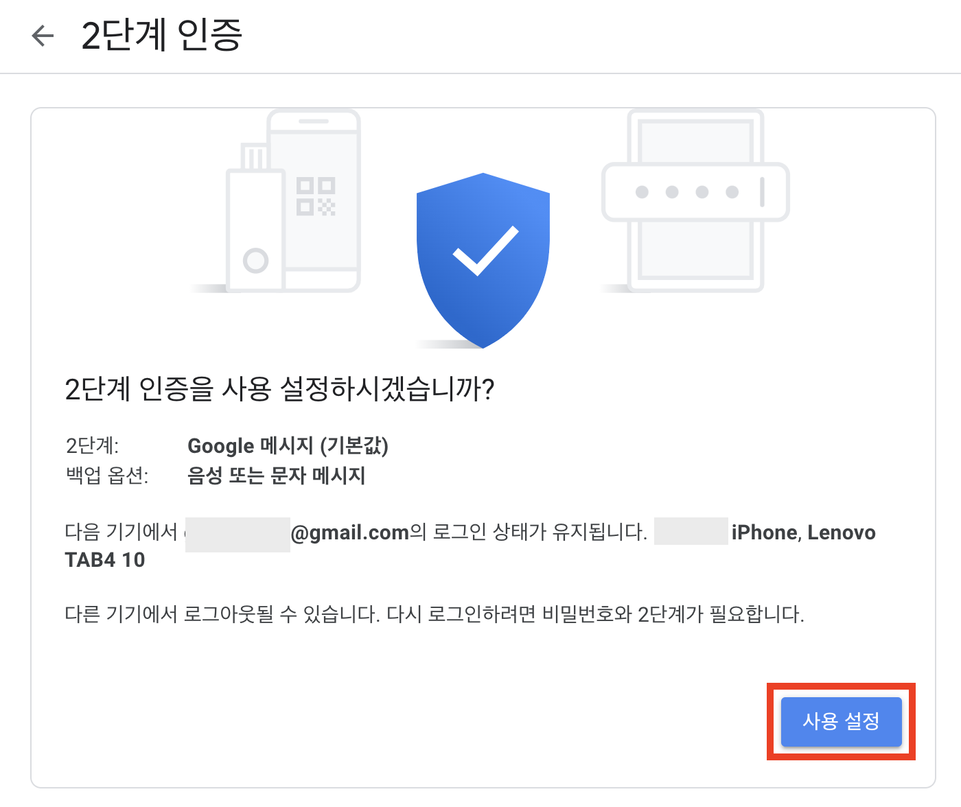 7. 최종적으로 2단계 인증 설정의 내용을 확인한 후 "사용 설정"을 클릭하여 마무리합니다.