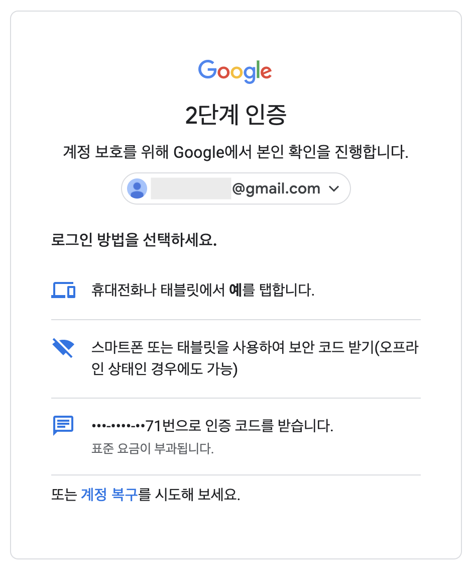 계정 탈취를 예방할 최소한의 안전 장치로 기본적인 구글 메세지를 통한 2단계 인증은 필수입니다.