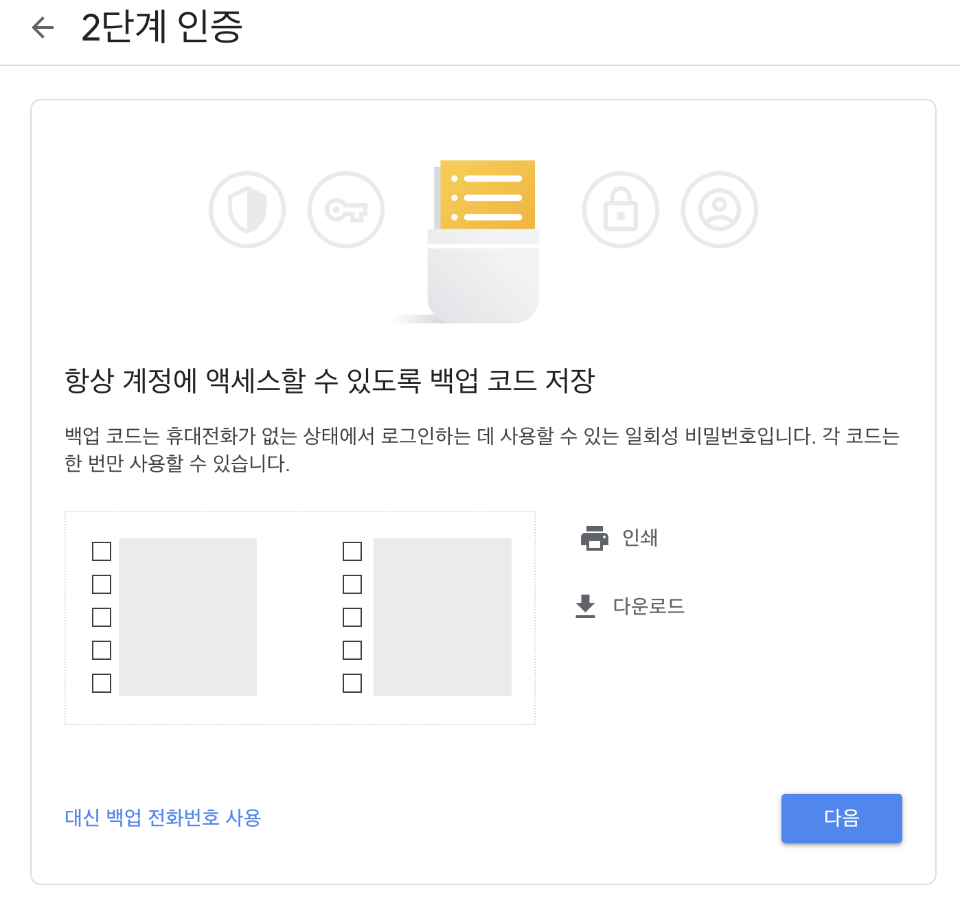 혹은 "다른 백업 옵션 사용"을 클릭하여 백업에 사용될 백업 코드를 저장한 후 진행합니다.