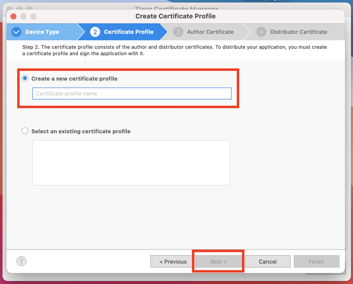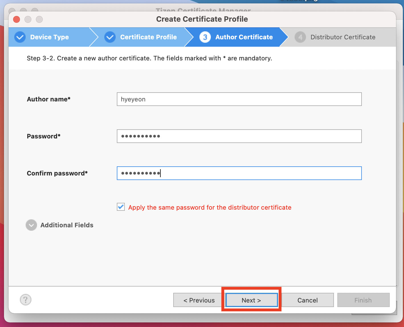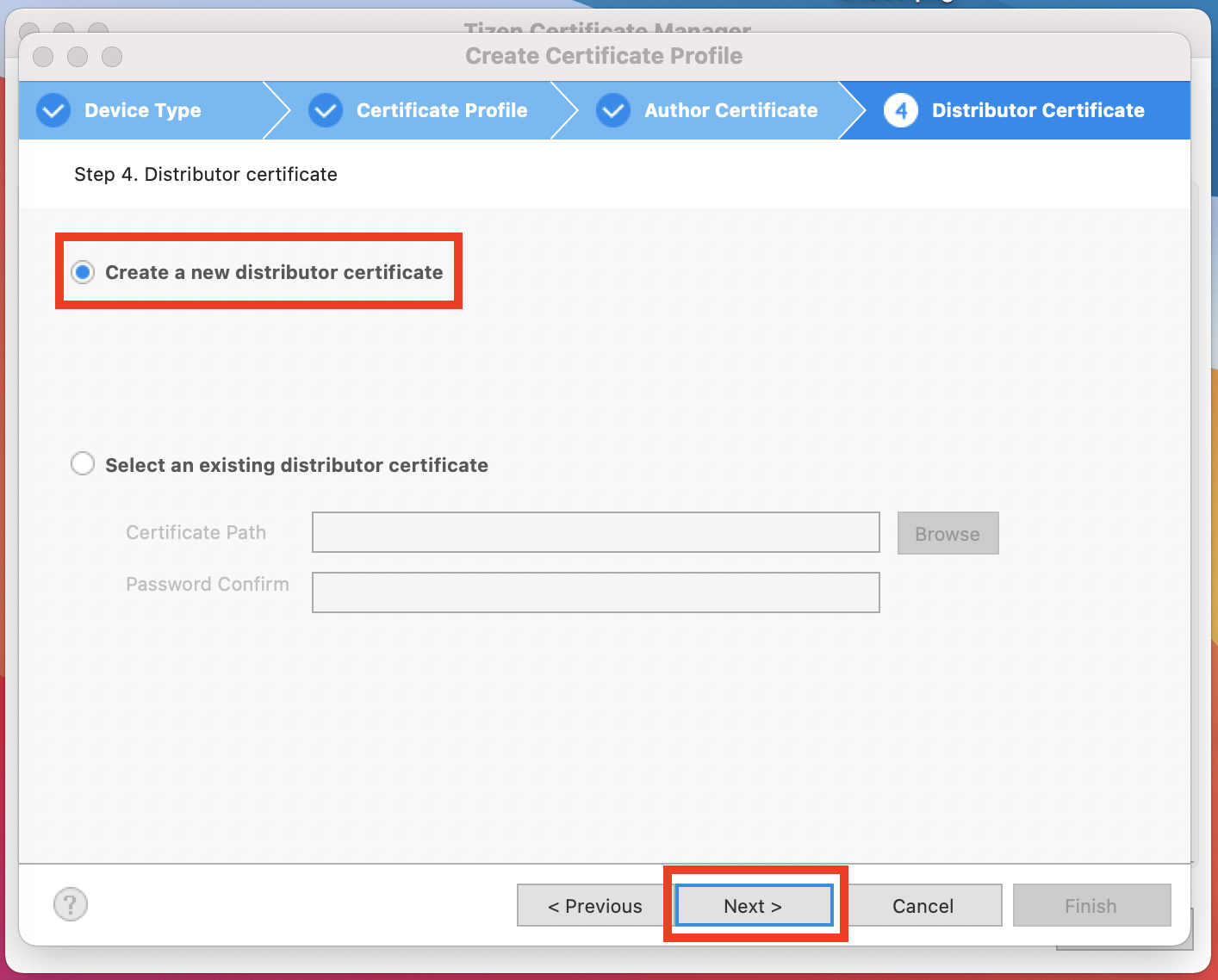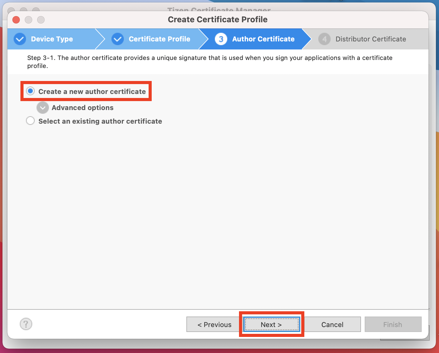 4. 'Create a new author certificate'를 선택한 후 다음으로 넘어갑니다.