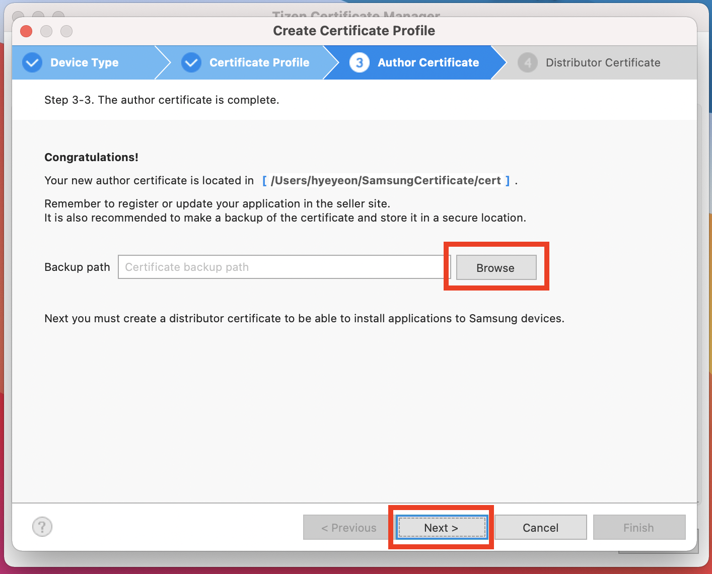 6. Author certificate를 저장할 위치를 선택한 후 Next 버튼을 클릭합니다.