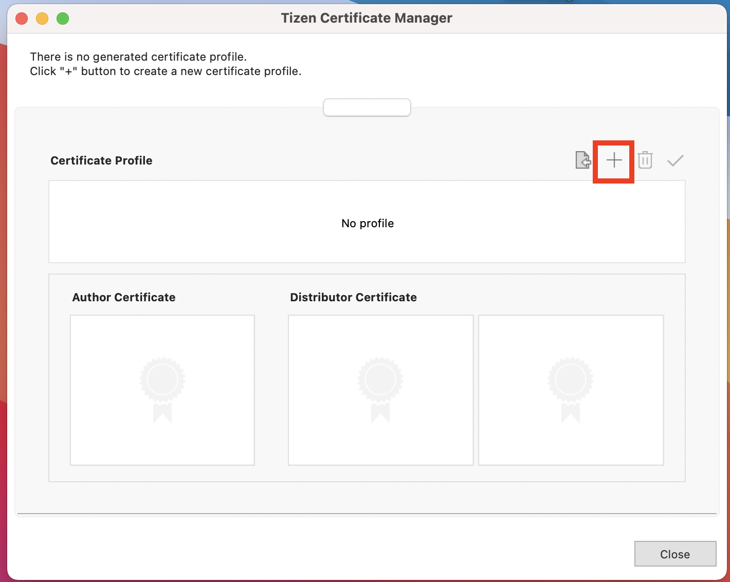1. Tizen Certificate-Manager 를 실행하여 + 버튼을 클릭합니다.