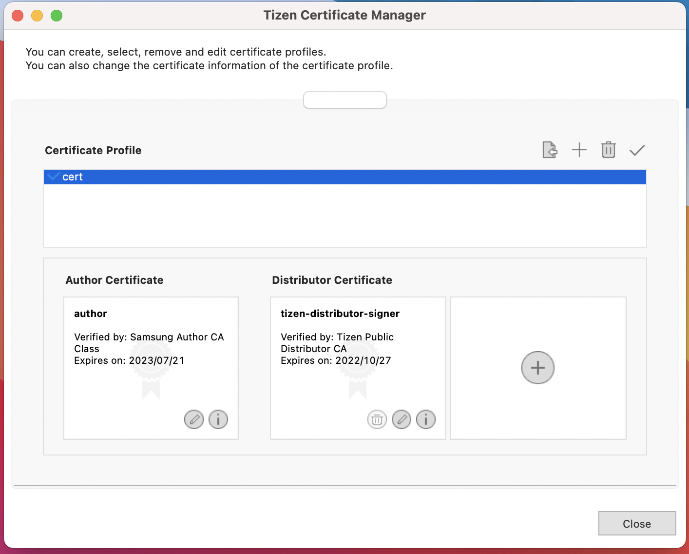 9. Tizen Certificate Manager 메인 화면으로 이동되며 생성된 Certificate Profile을 확인할 수 있습니다.