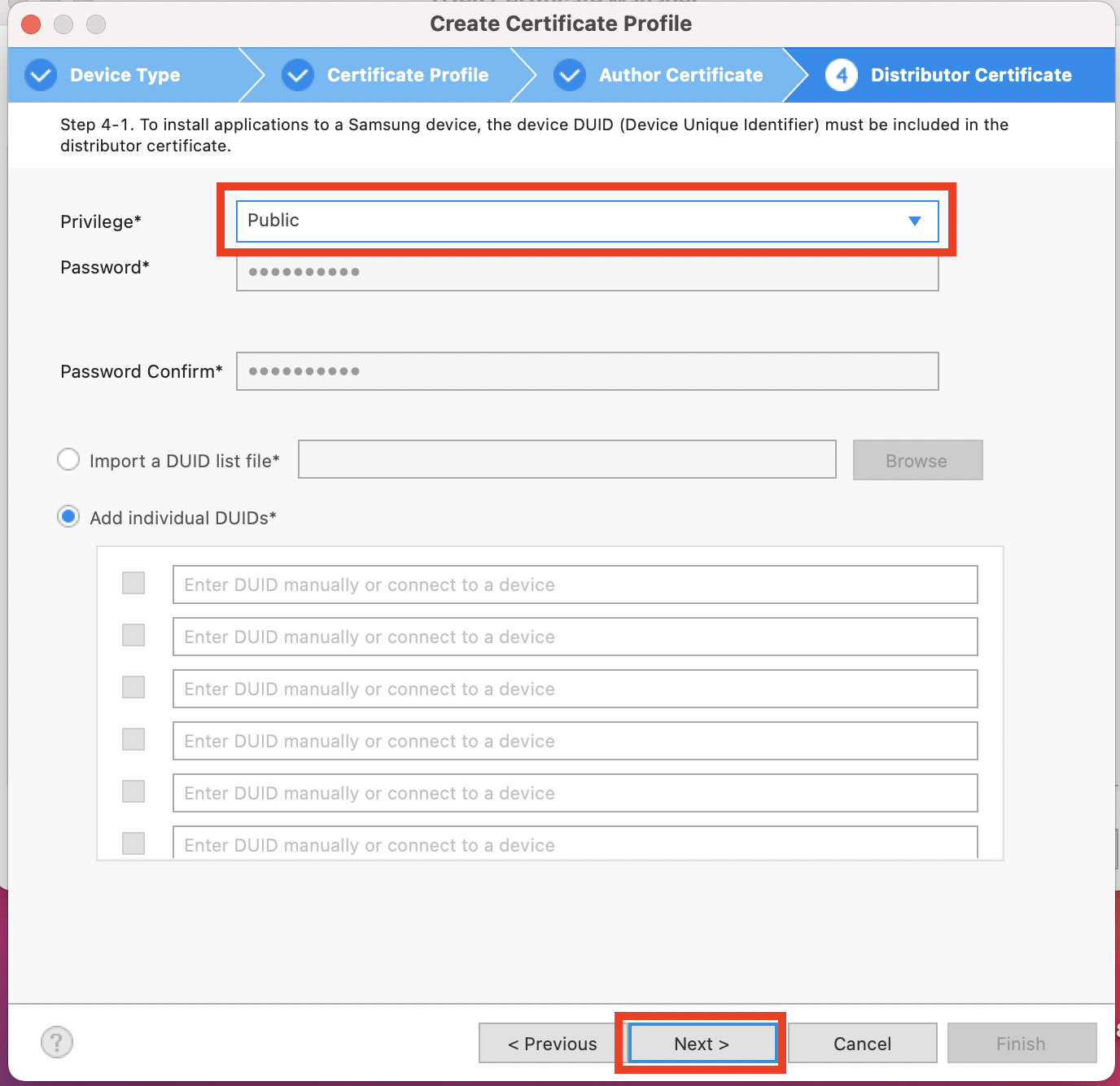 7. 'Create a new distributor certificate'가 선택된 상태로 넘어갑니다.