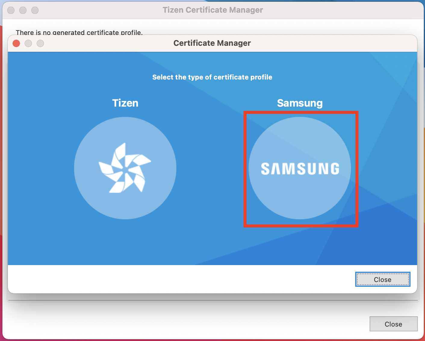 2. 에뮬레이터에서 사용할 경우엔 Tizen을, 실제 기기에서 사용할 경우엔 Samsung을 클릭합니다.
