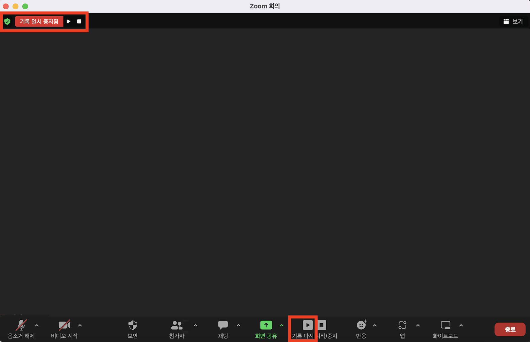 ※ 일시 중지 해제 - 좌측 상단의 ▶︎를 클릭하거나 하단의 "기록 다시 시작" 버튼을 클릭하여 녹화를 이어서 진행합니다.