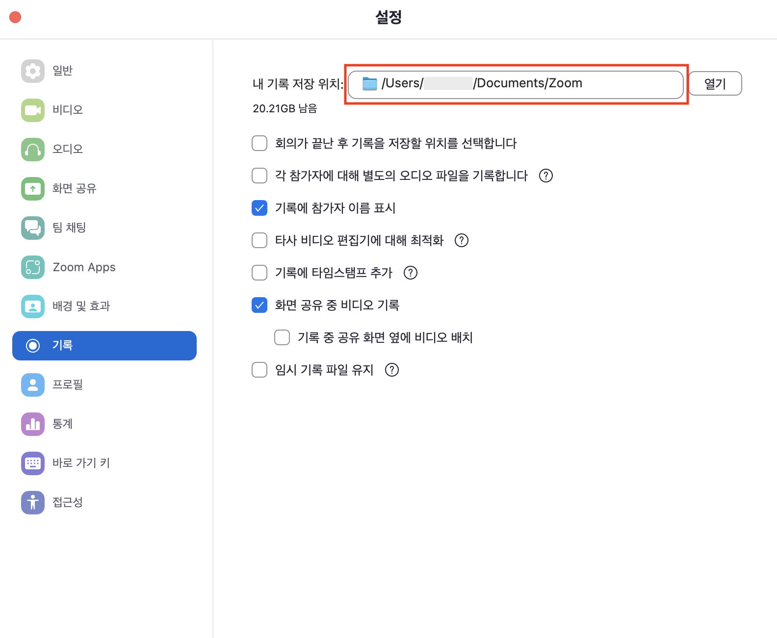 줌 설정의 '기록'에 들어가면 '내 기록 저장 위치'로 지정된 폴더에 .mp4 녹화 파일이 저장됩니다.