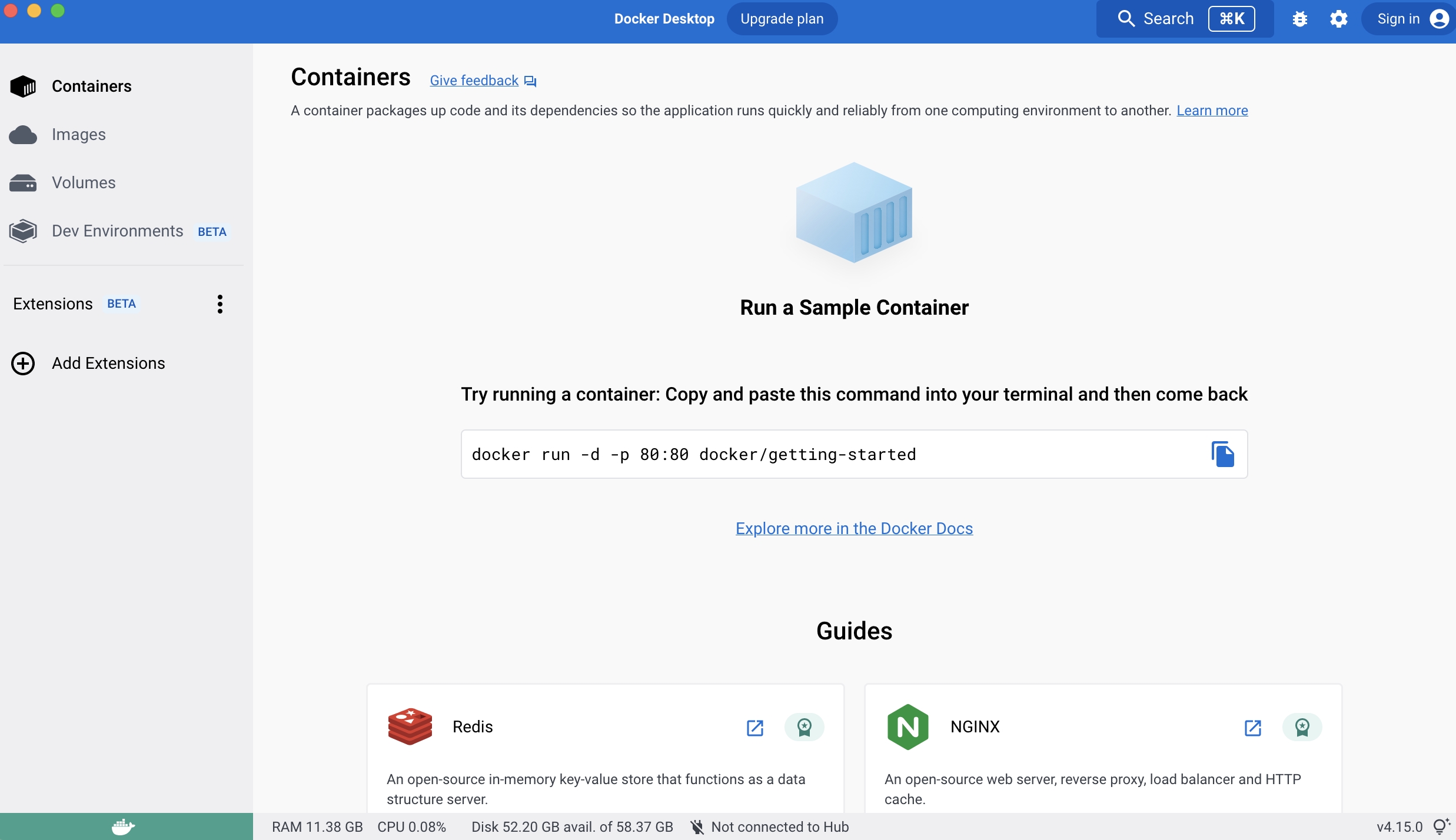 설치 후 Docker Desktop을 실행하면 아직 컨테이너가 없기 때문에 아래와 같은 화면이 표시됩니다.
