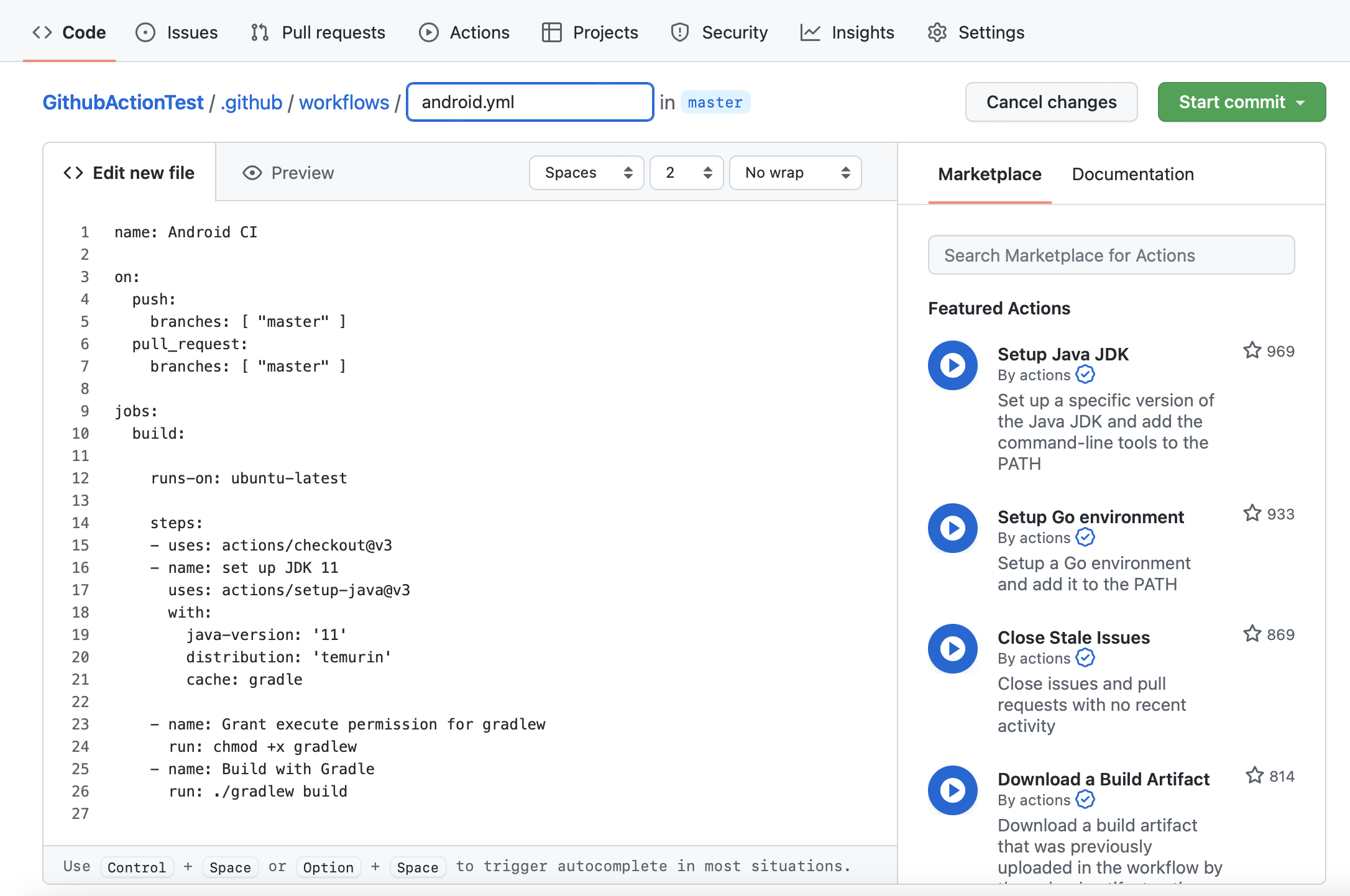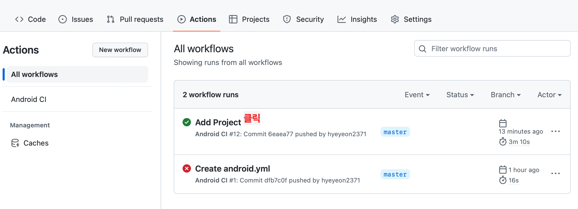 android.yml 내용에 따라 master 브랜치로 푸시하면 workflow가 실행됩니다.