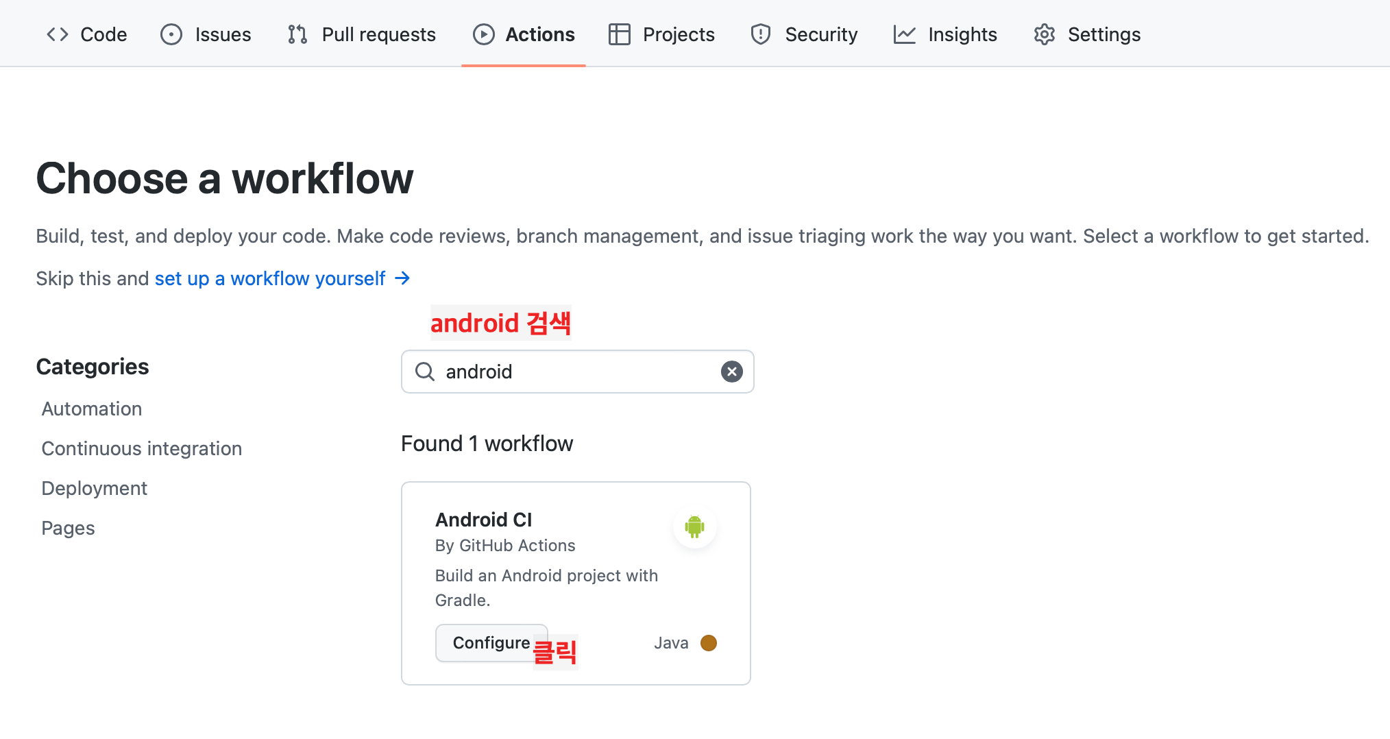 방법 2. Github Repository의 Actions에서 android 템플릿을 검색해서 사용