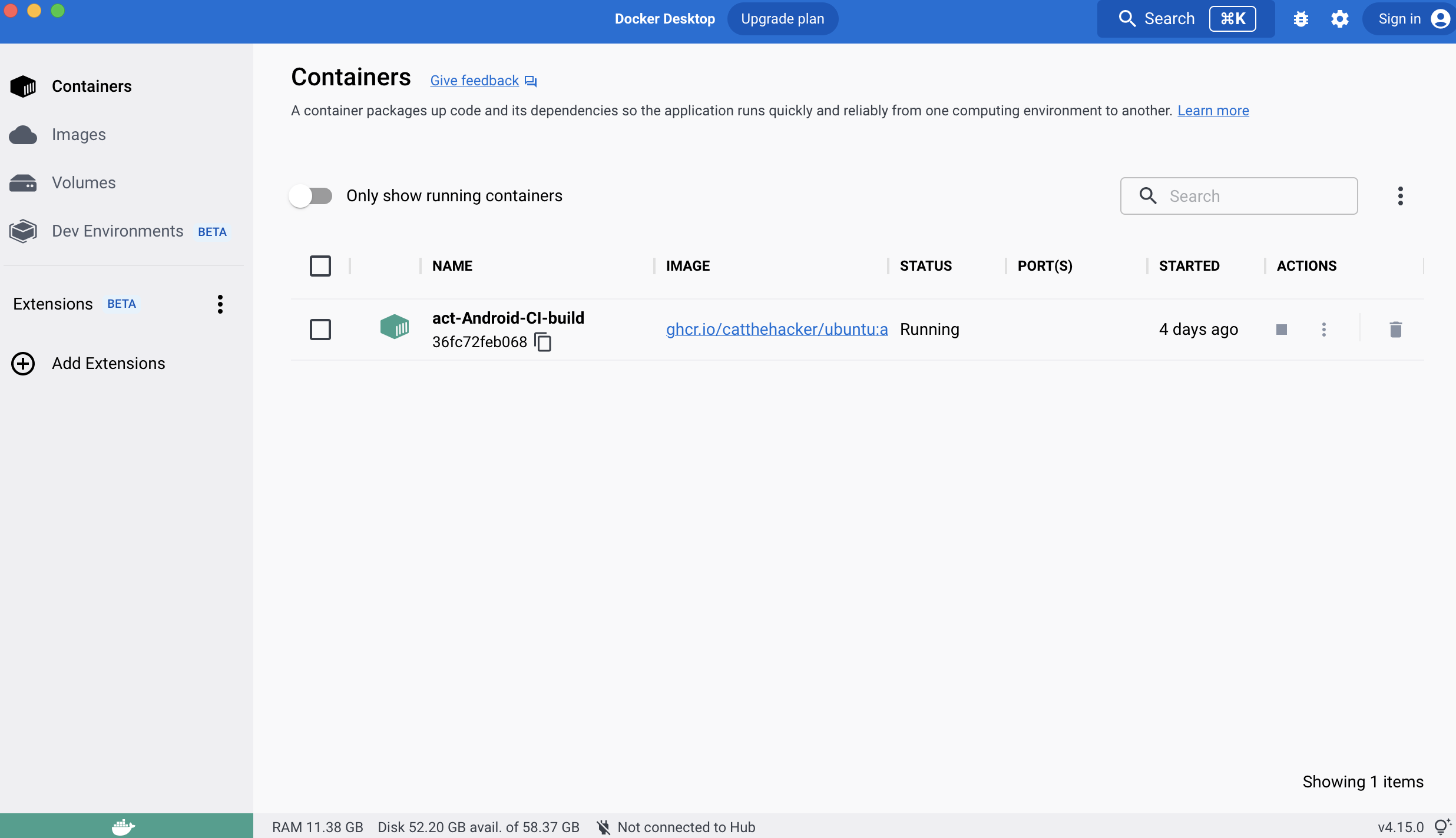 act를 실행한 후 Docker Desktop에서 컨테이너가 생성된 것을 확인할 수 있습니다.