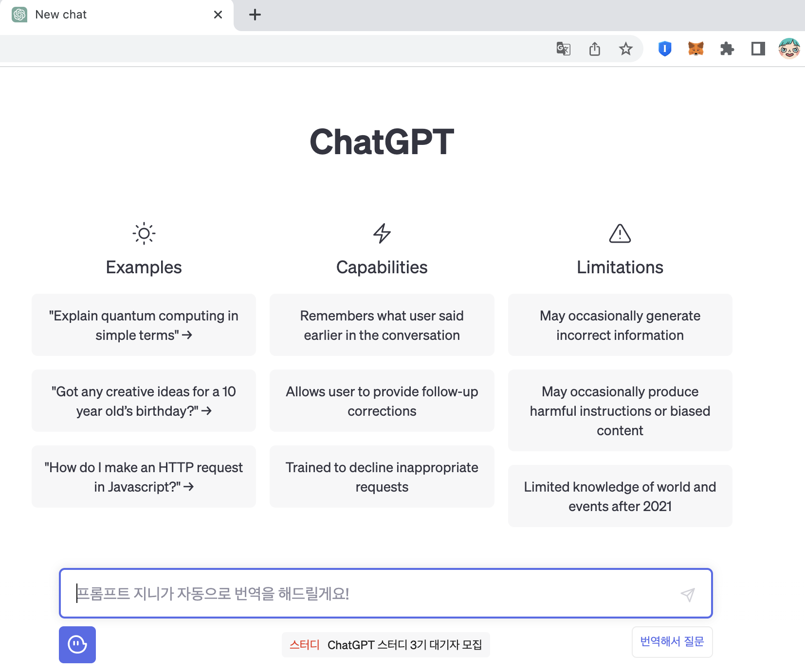 크롬의 확장프로그램인 프롬트프 지니를 추가하면 한글로 챗GPT를 사용할 수 있다.