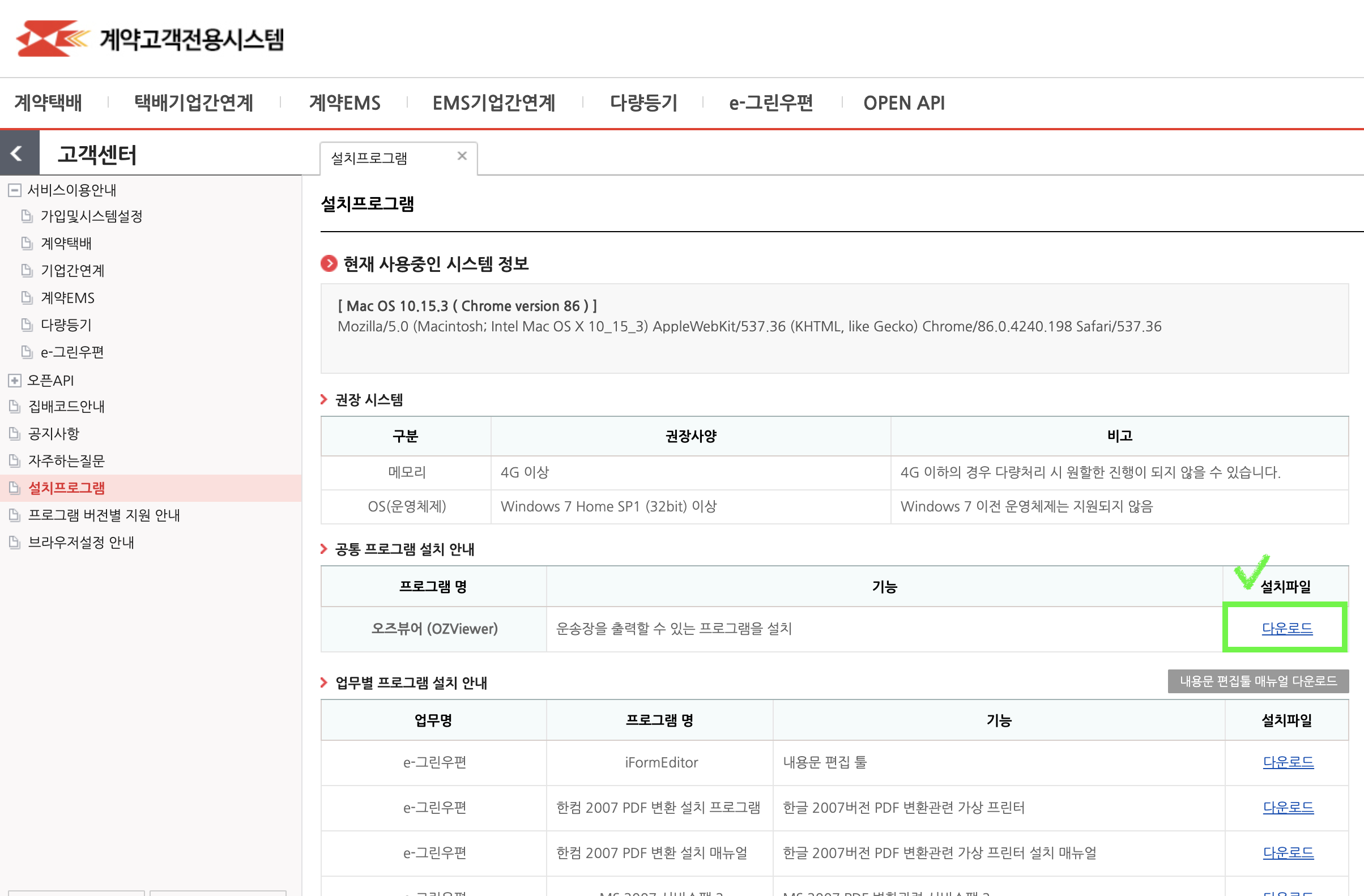 2-3. 공용프로그램 설치 안내의 오즈뷰어(OZVierwer)의 다운로드를 클릭하여 설치 프로그램을 다운로드한 뒤 설치를 진행합니다.